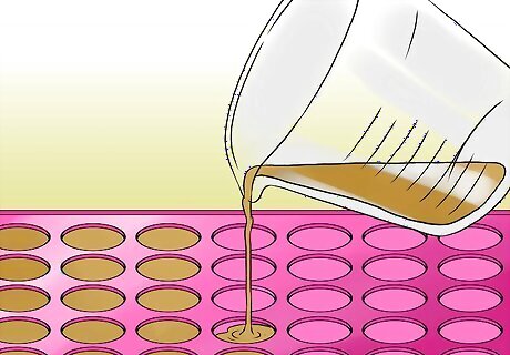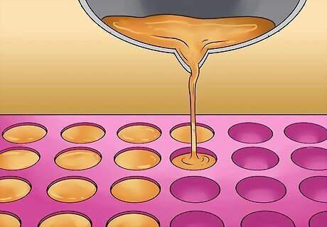 Transfer the hot mixture into a Pyrex measuring cup to pour it into your sugar molds. Pour slowly and carefully. Pour the hot liquid into each of the small depressions in the powdered sugar on the baking sheet you prepared earlier. Alternatively, you can use a greased candy mold. If you don't have a candy mold or don't want to use sugar, you can pour the liquid onto a piece of greased parchment paper. Be aware that this is the messiest way to do this.