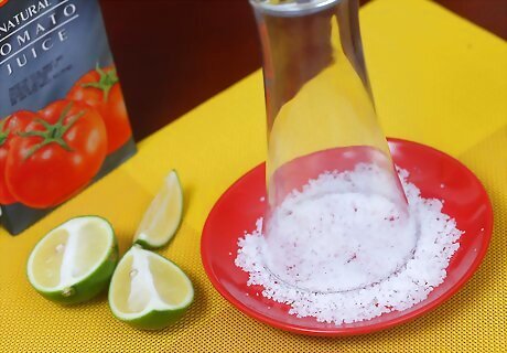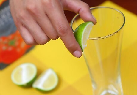 Cover the rims of a few glasses with lime juice. Just run one lime wedge around the rims of the glasses.