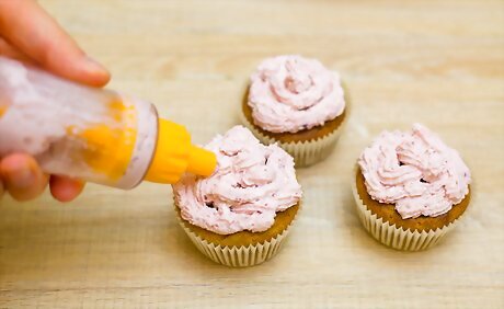 Frost and garnish the cupcakes. Spread the frosting onto the cooled banana cupcakes or pipe the frosting. To pipe the frosting, fill a pastry bag or plastic freezer bag with the frosting. Use a pastry tip of your choice or cut a corner of the plastic bag so you can pipe the frosting onto each cupcake. To garnish the cupcakes, consider topping them with: Sliced strawberries or bananas Banana candies Pink sprinkles Strawberry sauce