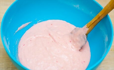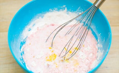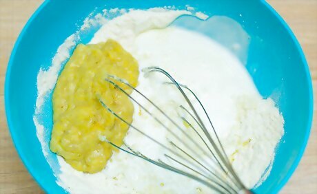 Combine the wet ingredients add the dry ingredients. Place 4 large eggs, 1/2 cup (125 g) of strawberry yogurt, and 1 cup (240 ml) of milk in a large mixing bowl. Beat the wet ingredients with an electric mixer until they're completely combined. Sift one box of dry strawberry cake mix and 4 tablespoons of dry instant strawberry pudding mix to the wet ingredients. For a stronger banana flavor, you could use dry instant banana pudding instead of strawberry.