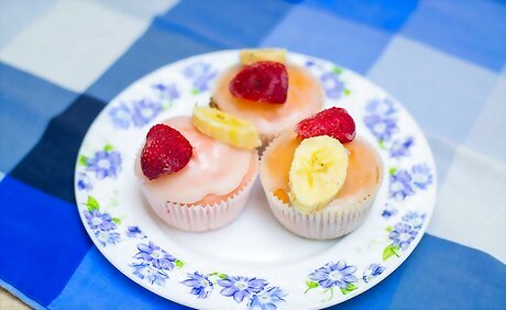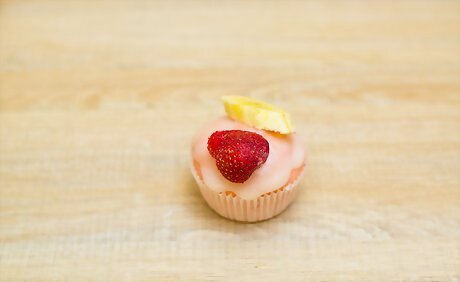 Frost and garnish the cupcakes. Scoop one 12-ounce (340 g) container of ready-to-spread whipped vanilla frosting into a mixing bowl. Add 1 teaspoon of banana extract and beat the frosting ingredients with an electric mixer until it's completely combined. Use an offset spatula to spread frosting over the cupcakes and top each one with a banana or strawberry slice. For a more professional look, you could fill a piping bag with the frosting. Pipe the frosting onto the cupcakes using your favorite piping tip.