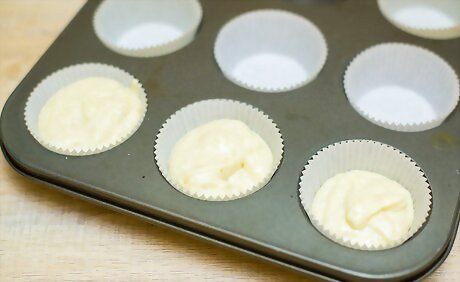 Bake the cupcakes. Scoop 3 tablespoons of cupcake batter into each prepared muffin liner. You should fill 2 muffin tins to make a total of 24 cupcakes. Bake the cupcakes in the preheated oven for 16 minutes or until an inserted toothpick comes out clean. Remove the cupcakes and let them cool completely before you frost them. Consider using a cookie or ice cream scoop to scoop the batter into the muffin tins.