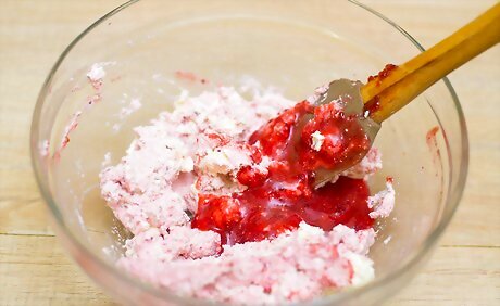 Make the frosting. Place 3/4 cup (170 g) of softened, salted butter and 4 ounces (115 g) of softened cream cheese into a large mixing bowl. Beat the butter and cream cheese on medium speed until the mixture is light and fluffy. Slowly stir in the pureed strawberries and add 3 1/2 cups (437 g) of powdered sugar on low speed. Once the powdered sugar is mixed in, you can turn the speed up to high and beat the frosting for a minute. Ensure that the cream cheese and butter are at room temperature. This will prevent the frosting from being lumpy.