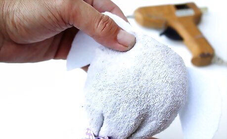 Add your animal's ears. Cut them out of fabric scraps. Sew/glue them onto your animal's head.