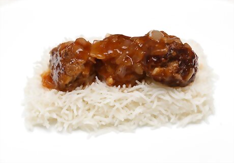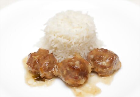 Serve the meatballs over rice. You will need about ½ cup (125 grams) of cooked rice per person. White rice would be the most traditional, but you can also use brown rice instead, if you'd like a healthier meal.