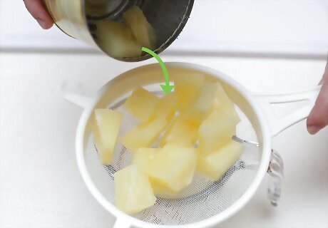Drain the canned pineapple chunks, save the juice, and set the chunks aside. Place a strainer over a measuring cup, then pour the pineapple chunks into the strainer. Jiggle the strainer to get any last juice out, then set the strainer aside.