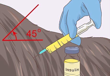 Give your dog insulin. Many older dogs with diabetes need daily insulin injections. Insulin shots are usually given in the dog’s back by folding the dog’s skin and using a special syringe or a VetPen. You should hold the needle at a 45-degree angle in your dominant hand. Push the plunger down with your thumb as quickly as possible so as not to prolong your dog’s discomfort. When your vet prescribes insulin, they will show you the proper way to give your dog insulin injections. Use only the syringes supplied by your vet, and use them only as directed. Do not repeat an injection if you cannot tell whether the injection went in. Rather than injecting the same spot repeatedly, which may cause pain for your dog, vary the injection site a little every day.