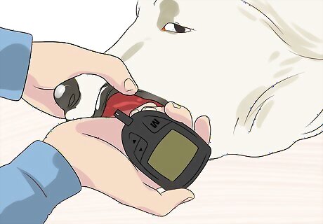 Monitor your dog’s glucose level. Often, vets will instruct you to check your dog’s glucose levels so you can monitor their condition. This is generally done using a glucose meter or a dipstick provided by your vet. You should use the meter or dipstick to check your dog's urine on a daily basis. When you check your dog’s glucose level using the provided meter, you will have to prick the dog’s skin on a hairless area to get a drop of blood. The urine dipstick helps monitor your dog for glucose levels as well as conditions like ketosis. If ketones appear on the dipstick after testing, consult your vet immediately for advice. Log the dog’s glucose level so you can discuss it with your vet, and schedule an immediate vet visit if your dog shows any signs of an illness that can destabilize a diabetic pet, such as a stomach ache, a sore mouth, or an ear infection.