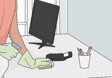 Clean up your work space if it’s on the messy side. Look over your desk or work area and see if it’s affecting your morale. If your space is cluttered and messy, you may feel some lingering stress and disorganization. In your free time, take a few minutes to sort and recycle leftover papers, and toss out anything you don’t need. Try getting in the habit of cleaning your desk once a week, so your workspace is completely clean.
