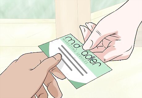 Network to meet people and make connections. Attend events that are related to your field, go to conferences, and enroll in workshops to meet potential clients and fellow professionals. Talk to the people you meet, hand them a business card, and follow up with them later. This will help you build a community to support your career. Treat every person you meet as a potential networking contact. Hand out your business cards to everyone you meet.
