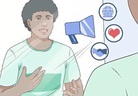 Promote your goods or services by showing off your work. Instead of trying to sell yourself to clients, show them what you have to offer. Provide examples of your work and help clients understand how you’ll help them. Keep the focus on your client and the work itself, not on yourself. For instance, let’s say you have a dog walking service. On your website, promote yourself with pictures of you walking dogs and playing with them. In person, get people talking about their dogs, then talk about the care you’d provide for their dogs. Don’t talk about how much you love dogs, why you started your business, or what you love about dog walking.