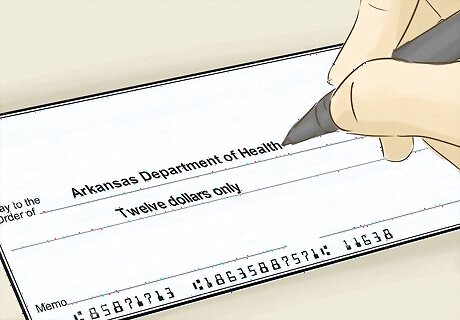 Pay a fee. You will need to pay with cash, check or money order for the exact amount. The first copy of the certificate costs $12. Each additional copy costs $10. Make checks or money orders payable to “Arkansas Department of Health.” Credit cards are not accepted by Arkansas Vital Records.