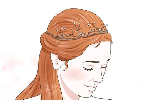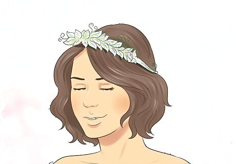 Use leaves. Many headpieces or head bands use real or artificial leaves to give a nod to nature for your big day. Leaves are slightly more decorative than twigs, but not as showy as flowers. They can be a good in-between if you want a nod to nature that's neither too played down or too dressy. You can wear leaves in your hair like flowers, with them tucked behind the ears or braided in. You can also opt for a crown that uses leaves.