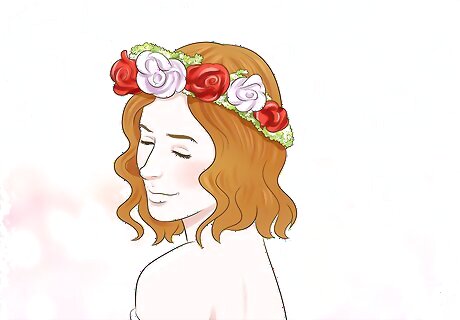 Wear a floral crown. A floral crown is a crown of flowers you wear wrapped around your head. It has a lovely, bohemian vibe that can serve to replace your veil if you want something slightly less dressy but still retaining a feminine feel. Floral crowns can be made from real or artificial flowers, depending on your preferences. A floral crown can easily make use of your wedding colors. For example, if your colors are pinks, you can make a crown using flowers like roses. If your colors are silver, you can try something like baby's breath.