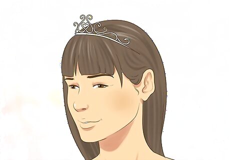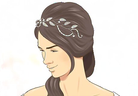 Wear a tiara. If you want the princess look for your big day, a tiara is a great option. A tiara can be worn on the tip of your head, holding your hair back. Tiaras work great if you want something very traditionally feminine for your wedding. You can wear a tiara on the top of your head and let your hair hang down or pull part of it back. You can also pin your hair back using a tiara.