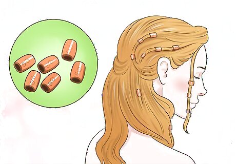 Use hair beads. If you want something more fun and bohemian than a traditional veil, opt for hair beads. You can weave beads right into your hair, allowing it to hang loose on your big day. Beads come in a variety of shapes and colors, allowing you to have a more fun, down-to-earth look for your big day. You can also use a headpiece or crown embellished with beads. This can work great if you like the beaded look but don't want anything too bohemian for your wedding day. In addition to beads, you can also weave feathers or chains into your hair.