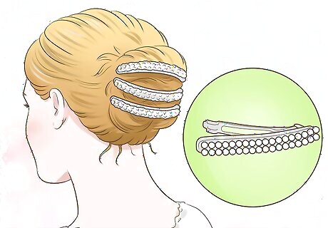 Add a barrette or comb. You can purchase a decorative comb or attractive barrette at a jewelry store. Before your big day, have the ornament embedded into your hair in place of a veil. Barrettes and combs can work great because they do the work of the veil in terms of keeping your hair out of your face. However, they do not conceal as much of your face and hair as a real veil would. Combs can be embedded into your hair. You can wear a comb at the top of your head or ton one side, depending on your hairstyle.