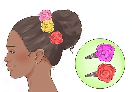 Try flowers or flower hair clips. If you like flowers but do not want something circling your whole head, you can try wearing flowers or flower clips in your hair. This leaves most of your head and hair exposed, which can be great if you want to show off a particular hairstyle for your big day. Real flowers have a nice, authentic touch, but may wilt throughout the day. However, a florist may be able to treat flowers to keep a fresh look for the duration of your wedding day. If you prefer, however, you can use floral hair clips instead, giving a nod to nature but using slightly more sustainable jewelry. Flowers can be braided into the hair, tucked behind the ears, or distributed throughout the hair for a more undone look. As with a floral crown, you can use this to highlight your wedding colors.