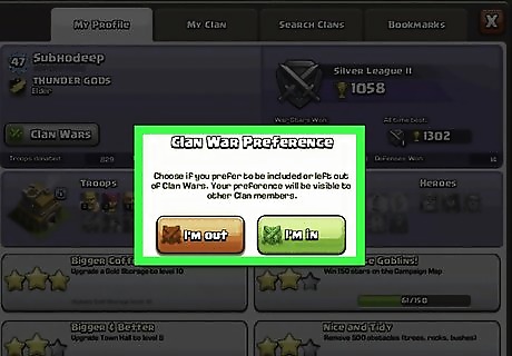 Press I'm out. After pressing Clan Wars, the Clan War Preference will come up. Then press I'm out.