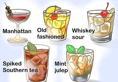 Order a whiskey cocktail. Whiskey cocktails are mixed drinks that have whiskey in them. Cocktails are ideal for individuals who enjoy the subtle taste or whiskey, or are getting used to drinking whiskey. There are classic whiskey cocktails for all palates: Manhattan (rye whiskey or bourbon, sweet red vermouth, and bitters) Old Fashioned (bourbon, 1 sugar cube, bitters) Whiskey Sour (whiskey, lemon juice, simple syrup) Spiked Southern Tea (bourbon, maple syrup, black tea) Mint Julep (bourbon, mint, simple syrup)