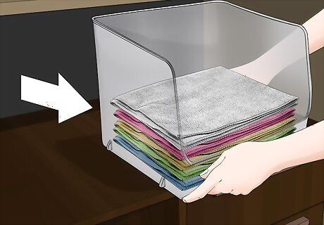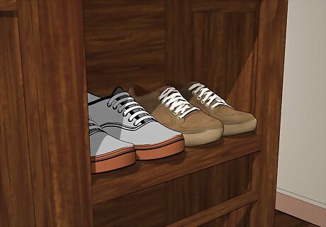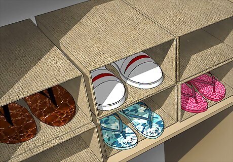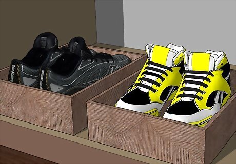 Store shoes in a basket or box with dividers. Athletic shoes and other casual shoe are made to handle a bit more wear and tear, so they don’t need to be lined up on a shelf. Wine boxes with dividers make a great homemade shoe caddy for athletic shoes. A basket in the entryway can hold house shoes or athletic shoes and looks much better than a pile of shoes on the floor.