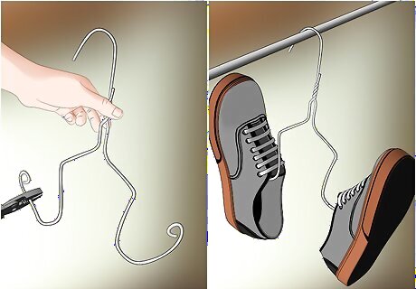 Make your own wire shoe hangers. As an alternative to shelves or an over-the-door hanger, you can make your custom hangers. Make DIY hangers for flip-flops and sandals by cutting and molding a normal wire hanger. Use pliers to cut the bottom section from a simple metal hanger (the kind you get from the dry cleaner’s) Next, use pliers to curl the ends up and out into two hook shapes. Curl the rough ends into a smaller loop at the end of the hook to avoid getting poked by this end. Each hanger hook will hold one pair of sandals. Hang from an existing clothing rod in your closet or install one below your normal hanging rod.