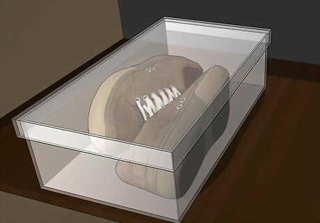 Place shoes in clear plastic boxes with lids. A transparent box protects your shoes and makes it easier to see them without having to move the boxes. While these boxes are great for storing any type of shoes, you might have to limit what you store in them due to space or monetary concerns. Shoes not worn often or nicer shoes are a good candidate for these boxes. You can stack the boxes on top of one another on shelves in your closet, on a bookshelf, or under your bed.