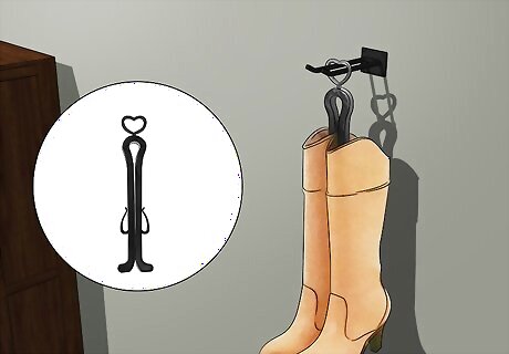 Hang boots from hooks or store upright. Tall boots will take up less space in your closet when they are not flopping over. When using a shelf to store your tall boots, an empty plastic water bottle or cut pool noodle in the leg will help keep boots upright. Either store them on a shelf sitting upright, or use boot hangers with clips to save space when organizing your boots.