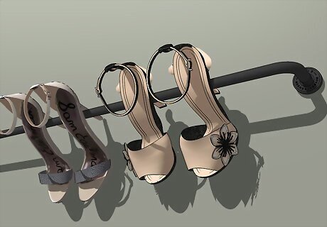 Create custom shelving for storing heels. Heels are more delicate and could get nicked or damaged more easily than other shoes. Storing them on shelves helps to prevent damage. A towel rack, tension rod or metal grid in your closet can serve as a shelf. Tensions rods or racks can go inside a closet door or on a wall. Hang the heels off of the rack or grid for organized and stylish shelving.