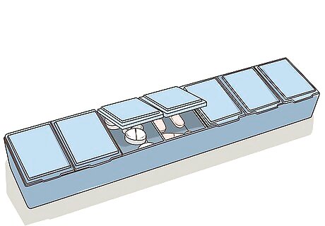 Consider storing medications in a weekly pill box to save space. If you need to take a lot of medications for allergies, pain, headaches, and so forth, consider keeping a few pills in a weekly pill box. Label each compartment with what's inside, such as: pain medication, allergy medication, and so forth. You will have to refill the pill box often, but at least you won't have to carry several bottles of medication in your purse, which can take up a lot of space. Consider keeping this in a zippered pouch along with other care items, such as dental floss.