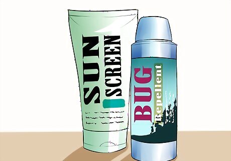 Include a small tube of sunscreen and bug repellant. Choose a high SPF sunscreen (50+) that is also water and sweat resistant. You will want to include this even if you are hiking in a shady locale. A sunburn can present a serious health hazard. Bug repellant lotion or wipes will keep you from getting bitten, reducing the risk of bug-borne diseases.
