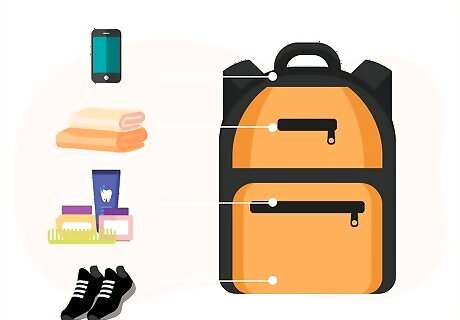 Pack from the bottom up. Start by packing your shoes either on the bottom of your bag or in your shoe compartment. Then pack all your items in your smaller compartments. Next place your toiletries into the bag, then add your towels and clothes on top so they won't get wet if one of your toiletries has a leak. Place any electronics or reading material on top.