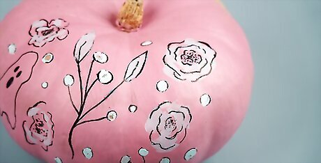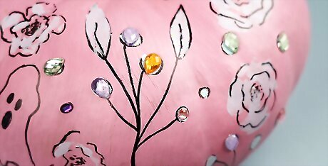 Add decorations or embellishments (optional). If you like, you can make your design even more fun and exciting with decorations and embellishments. Wait for the pumpkin to dry and then add a variety of fun adornments to your creation. Glue yarn or raffia around the stem of the pumpkin for hair. Sprinkle glitter on wet paint to add sparkle. Using glue dots, a glue gun or craft glue, add googly eyes, sequins, rhinestones, pom poms, beads, or craft foam shapes. Top your pumpkin with a hat for a final touch.