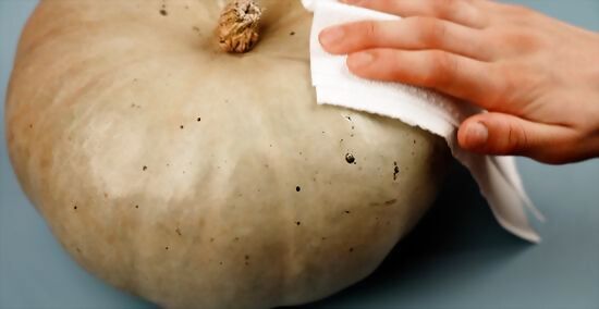 Clean and dry your pumpkin. Gently remove any dirt or grime using a dampened paper towel or a baby wipe. Use a soft, dry cloth to thoroughly but gently dry your pumpkin. Avoid brushing the pumpkin with a hard brush because you might bruise or scratch your pumpkin or just damage the skin. Take care not to get the stem area (top) or the blossom end (bottom) of the pumpkin wet. This can cause the pumpkin to rot.