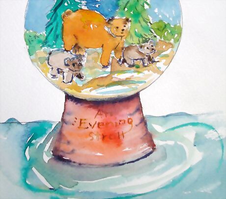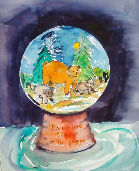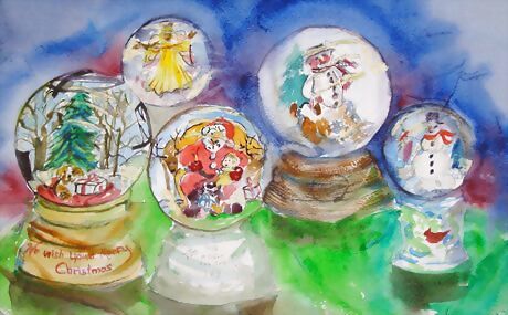 Create the magic of transparent glass with the shadows and highlights on the exterior of the glass. When painting transparent glass, most of the reflections are hard, dark, almost black shapes and are always seen at the edges of the glass object, contouring to the shape of the vessel. Study the globe and look for these shapes and try to replicate them, but stop at three or four. Paint them in barely diluted black over what is already down on the paper. For the white highlights, use the tip of a utility or craft knife and scratch small, curved lines to represent reflected overhead lights or window shapes, if that is what you see on close observation. Or, simply paint them with the same white you used to do the snow. Keep these to a minimum as well.