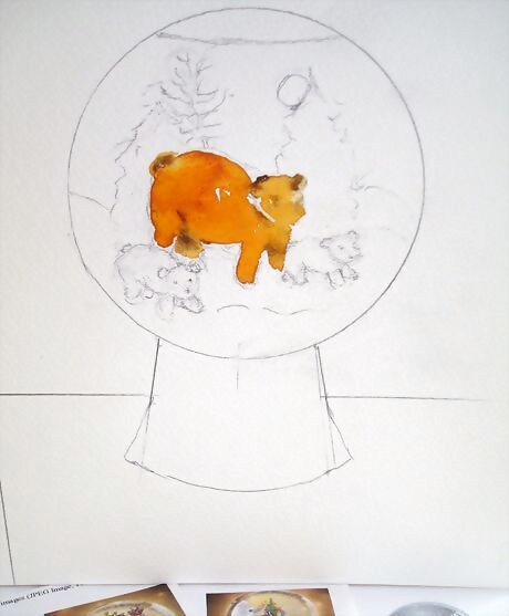 Paint the scene and base and let the piece dry. Draw an ellipse or curved line for the water line at the very top of the globe's interior and depict it with a fine dark, line.