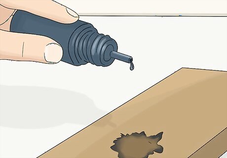 Apply a drop of alcohol ink to the wood where you want to place your knot. Hold the applicator tip just above the surface of the wood and give the bottle a gentle squeeze to release a single drop of ink. The ink will immediately begin spreading out over the wood in a rough circular shape. You’ll find alcohol ink at any major craft store, as well as some home improvement centers. For maximum realism, choose an ink in a color that matches the tone of the wood you’re painting. Dark brown inks will work best for medium-to-dark woods such as oak and walnut, whereas light-to-medium shades will appear more natural on brighter woods like birch, ash, and pine.Tip: Wear gloves and set up your materials in a well-ventilated space. Both the isopropyl alcohol and special dyes used to make alcohol inks could cause skin and airway irritation, if you’re not careful.