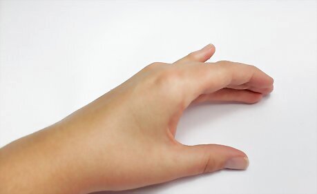 Place the left side of your non-dominant hand on the table in a relaxed manner and either straighten your pinky out and tuck your ring finger in under your hand or vice versa.