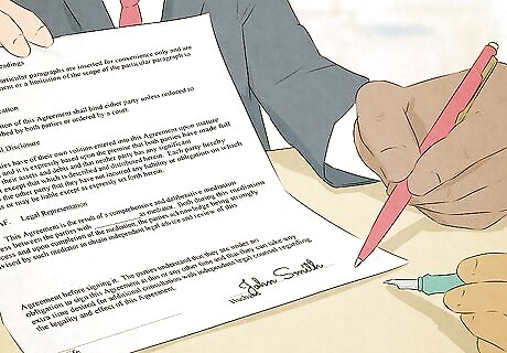 Sign your agreement in the presence of a notary. Many courts require legal agreements to be notarized. The notary verifies your identity so that neither spouse can claim later that they didn't sign the document. Even if it isn't required by the court, it's still a good idea to prevent problems later. Notaries don't check the legality of the agreement and can't give you legal advice on the content of the agreement. They merely verify your identity and observe the signatures.