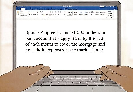 Describe your decision regarding joint expenses. After you've listed the expenses and bills you and your spouse have agreed to pay separately, add a list of joint accounts that still have both of your names on them. Provide an explanation of how those bills will be paid and who will be responsible for them. For example, if you're going to be living in the marital home and your spouse is going to provide money to help with the mortgage and other household expenses, you might include a statement such as "Spouse A agrees to put $1,000 in the joint bank account at Happy Bank by the 15th of each month to cover the mortgage and household expenses at the marital home." Include a statement acknowledging that you both understand that you're both responsible for these bills, even if only one of you is going to be making the payments.