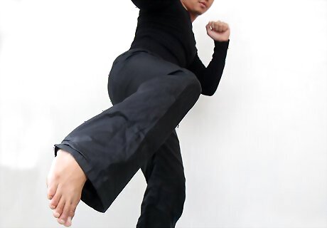 Perform Ni, the second move. Lift your left (or right) leg up off of the ground. Kick your leg forward as if you were hitting a person in the groin area using the palm of your foot.