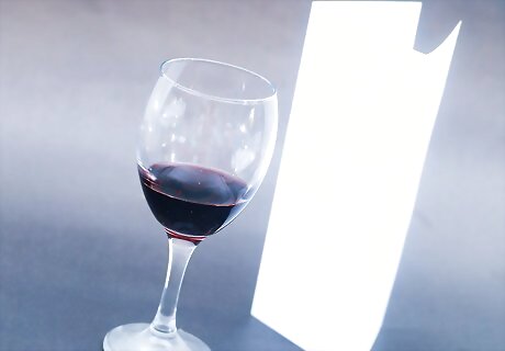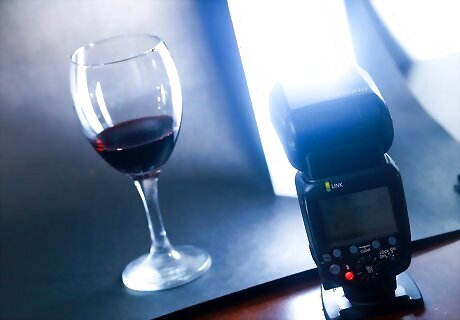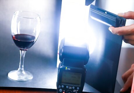Position the object to control reflections. If you want reflections included in your photograph, this can be a fun series of trial and error to see which effect you like best. If you're trying to minimize reflections and keep attention on the glass object itself, there are stricter rules to follow: Point the light source (or direct it with photo flags or barriers) so it illuminates the surfaces to the left or right of the object, not the object itself. Direct illumination usually leads to glare, but can be attempted for a more "glowing" effect. Minimize glare by sending the light through a photography diffuser, or a sheet of tissue paper. Point the light at roughly a 45º angle relative to the camera. Lighting from behind can reduce reflections, but requires a barrier between you and the glass to prevent a reflection or silhouette of yourself appearing in the glass.