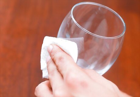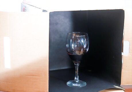 Surround the glass with black barriers. Place the glass in a black photo box if you have one, or surround it with black matte barriers underneath, behind, and to each side of the object. Pull these side barriers close together, or use additional barriers, to block light from the front and leave only a small gap for your camera lens. You can hold off on completely enclosing the area until after the setup below is complete, but keep this final goal in mind. You may need to use a "ceiling" for the area as well, if reflections are getting in over the top of the walls.