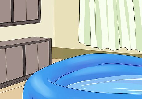 Organize your birthing area. Whether you plan to give birth on your bed or in your bathtub, you will want to set up well in advance. Make sure that everything you will need is in the room and stored in an easily accessible location. Find an ideal tub for a water birth. You can use your own bathtub or purchase a blowup pool or birthing tub. Warm water is best to help you relax during birth. Be sure to have some extra towels handy as you will likely be in and out of the water. Prepare a protective covering for your bed or carpeted area. You can a purchase plastic covering or use old sheets.