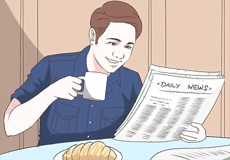 Have things to do while you eat. Another thing you can do while dining alone is bring something to occupy your mind. For example, if you are out for lunch or breakfast you could try reading a newspaper or doing a crossword while you eat. Alternatively, you could bring a notebook to dinner with you. Write down notes about your day or some of the food you are eating. You could also try reading a novel while you wait for your meal to arrive.
