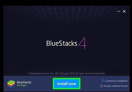 Click Install Now. It's the blue button at the bottom of the installer window. This installs BlueStacks. It may take a while to install. Once it finishes installing, BlueStacks will open automatically. If BlueStacks does not open automatically, click the BlueStacks icon on your desktop, Windows Start menu, or Applications folder to open BlueStacks.