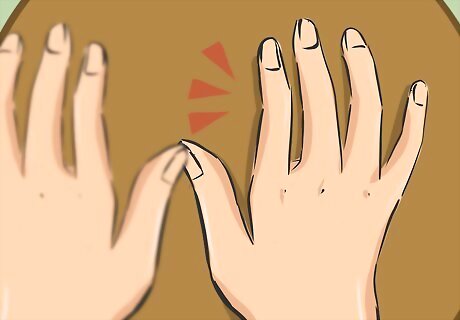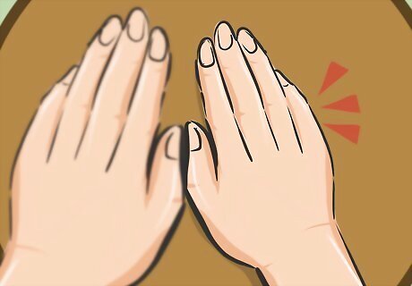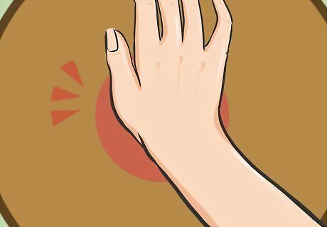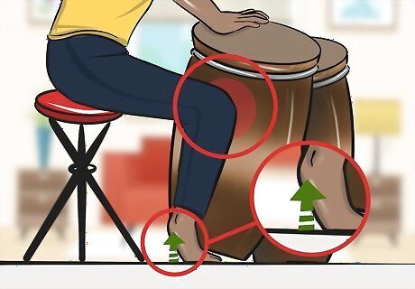 Hit the edge of a conga with the middle of your hand to make open sounds. An open sound is a sharp, metallic sound. Use the middle part of your palm, underneath your knuckles, to hit the edge of the conga to make this tone. Make sure to always keep your thumbs pointing up so they don’t hit the hard rim of the conga when you play this sound.