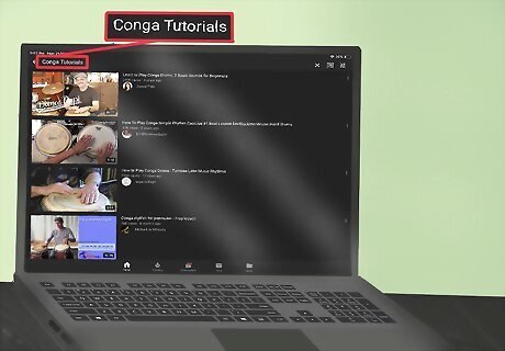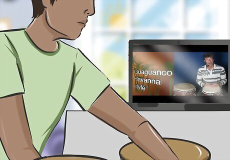 Watch video tutorials on YouTube to learn patterns and songs to play. There are tons of video on YouTube that break down different patterns for you. Follow along to these videos to learn more complex patterns. Use search terms like “conga tutorials” or “how to play the congas” to pull up videos. You can also search for specific types of music that you want to learn how to play.