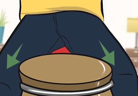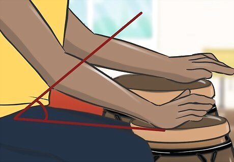 Sit down and put the congas in front of you. Sit in a chair or on a stool with the congas in front of you. Make sure to use a seat that is at the right height to let you comfortably reach out and play the congas. Once you get good at the congas, you can learn to play them standing up as well. There are special stands to hold the congas while you stand.