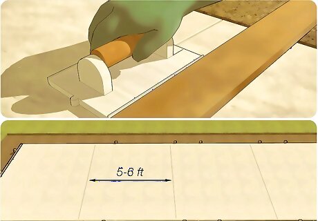 Make control joints every 5 o 6 feet (1.8 m) with a groover. Line up a plank as a straight edge to make periodic joints in the concrete. These joints will help the concrete withstand cracking due to temperature changes. Cut the joints about a quarter of the thickness of the concrete.